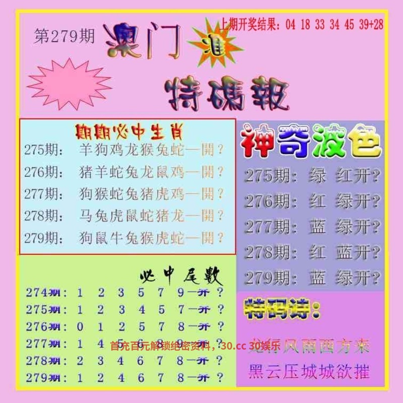 278期:独解傳眞 解:今期生肖二四开,二字来头七相送。一字一句要留意,看好红波在今期。十二生肖个个知,六合在前取投机。二七得三六相加,大王去找美人码。 送:马龙虎鸡蛇猪羊兔 抓住一句解必中特 |